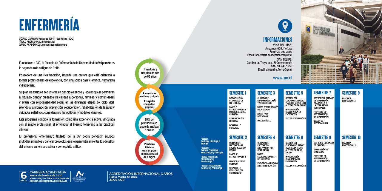 El egresado de Enfermería de la Universidad de Valparaíso, será capaz de gestionar, investigar, educar y proveer cuidados de enfermería integrales y de calidad, basados en principios éticos, legales, y disposiciones regulatorias que fundamenten su accionar; movilizando diversos sabe res fundantes de la profesión, que le permitirán ejercer en diferentes contextos sociales y de la red asistencial, en todo el ciclo vital de las personas, familias y comunidades, a través de la promoción, prevención, tratamiento, rehabilitación de la salud y cuidados paliativos, tanto en intervenciones independientes, como interdependientes.